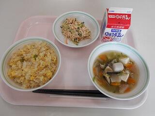 チャーハン、春巻、ナムル、五目豆腐スープ、牛乳