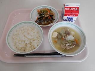 麦ごはん、牛乳、いわしの甘露煮、おかか和え、豚汁
