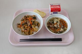 麦ごはん、牛乳、千切大根の卵とじ、団子汁、かりかりなばちゃん