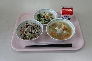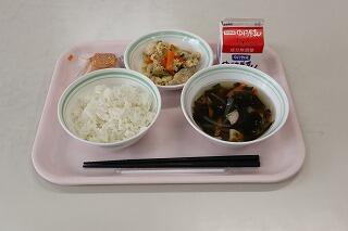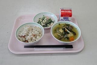 ひじきごはん、牛乳、みそけんちん汁、小松菜のサラダ