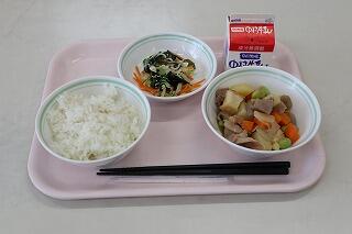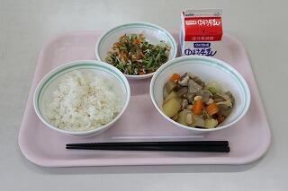 麦ごはん、牛乳、肉じゃが、ちくわとわかめの和え物、かみかみいりこ