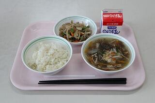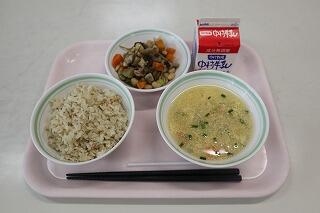 麦ごはん、牛乳、かみかみきんぴらごぼう、もずくのスープ