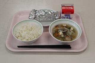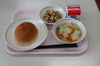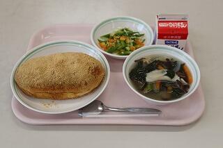 紅芋パン、牛乳、たこ焼き風、わかめスープ