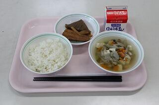 麦ごはん、牛乳、煮魚・こんにゃく、かみかみ根菜汁
