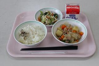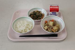 麦ごはん、牛乳、じゃがいものそぼろ煮、おかか和え