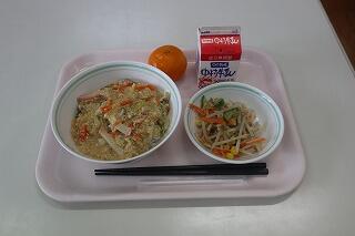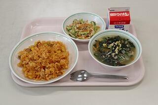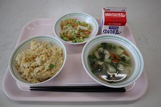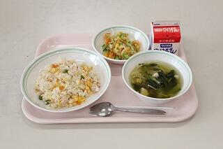 チャーハン、牛乳、野菜スープ、ピーナッツ和え