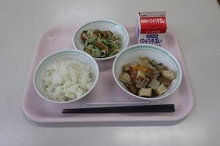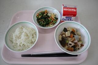 麦ごはん、牛乳、高野豆腐と昆布の炒り煮、千草和え