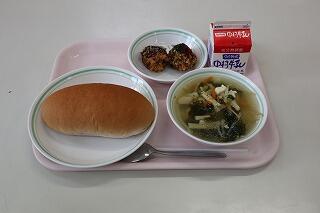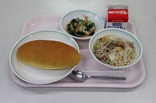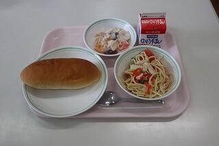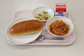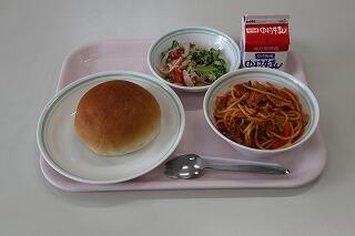 【ぬくもりランチ】ミルクパン、牛乳、トマトと玉ねぎのにこにこスープ、スパゲティサラダ