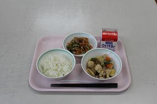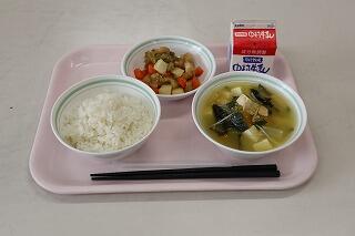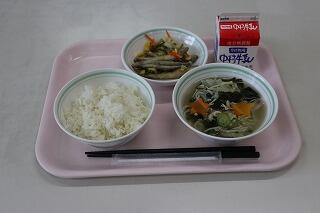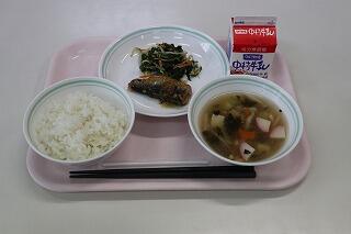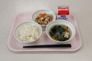 麦ごはん、牛乳、いわしのしょうが煮、もやしの酢の物、豆腐のすまし汁