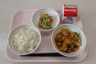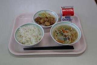 麦ごはん、牛乳、とり肉のから揚げ、添え野菜、魚そうめん汁