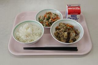 麦ごはん、牛乳、なすと厚揚げのみそ炒め、黒ごま和え