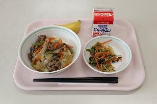 【ぬくもりランチ】高千穂牛丼、牛乳、からし和え、バナナ