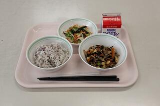 ゆかりごはん、牛乳、ひじきの炒り煮、甘酢和え