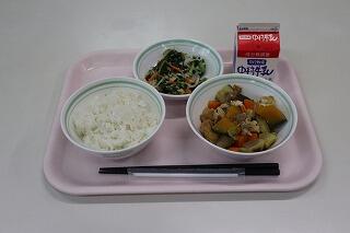 麦ごはん、牛乳、鶏肉とゴーヤの揚げ煮、かぼちゃのみそ汁