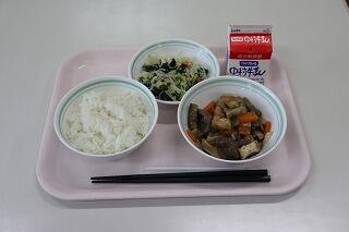【ぬくもりランチ】麦ごはん、牛乳、高千穂牛となすの炒め物、春雨の酢の物