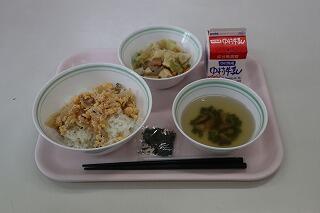【ぬくもりランチ】茶飯、牛乳、大和煮、かきたま汁