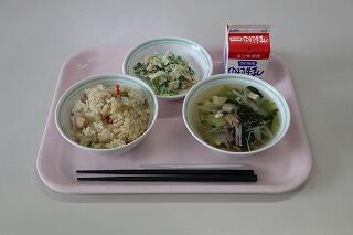 たこごはん、牛乳、かぼちゃのみそ汁、洋風白和え