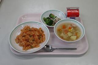 チキンライス、牛乳、ポテトスープ、ブロッコリーのサラダ