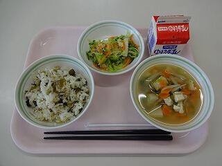 高菜めし、牛乳、吉野汁、いかと野菜のマリネ