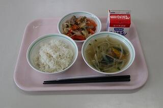 麦ごはん、牛乳、鶏肉と大豆の煮物、きゅうりと昆布の酢の物