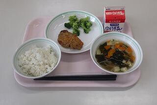 麦ごはん、牛乳、魚のしょうがみそかけ、ブロッコリー、五目汁