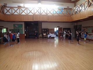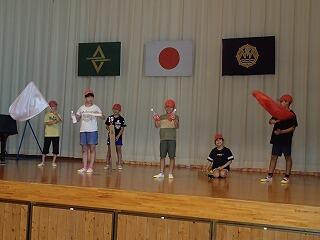 今、学校では毎朝運動会の歌を歌っています。この日は多目的ホールで団が向かい合って歌い、元気な声が校舎中に響き渡っていました。