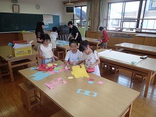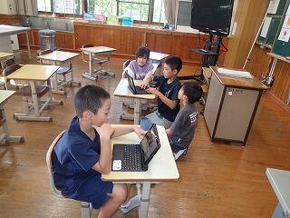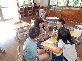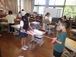 上学年が下学年に教える、友達同士で教え合う姿は、本校ではよく見られる光景です。他者に優しく接することができることが本校の子ども達のよいところの1つです。本校は、今年度、人権教育推進校になっています。これからもこのように他者のよいところを認めたり、困っている人を助けたりして、子ども達に望ましい人権感覚がさらに身につくことを期待して指導していきます。