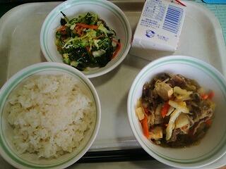今日の給食は『ごまだれ焼き肉、わかめスープ』