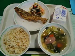 今日の給食は『茶飯、やまめの唐揚げ、もやしの酢