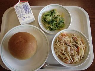 今日の給食は『ペペロンチーノ、フルーツカクテル』と、