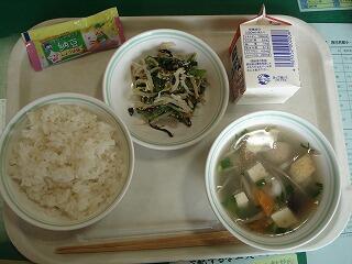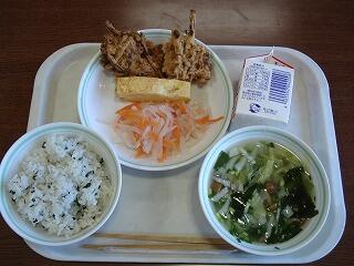 20日(金)弁当の日を前に、今日の給食はチャレンジ給食でした。これは、『わかめご飯、大豆のかき揚げ、