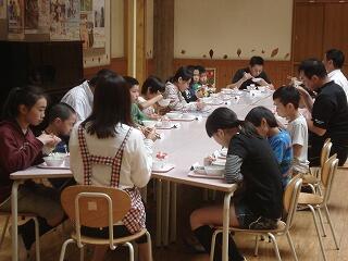 先生方も加わり、今日の献立『タコご飯、カボチャのみそ汁、千草和え』をおいしそうに食べていました。