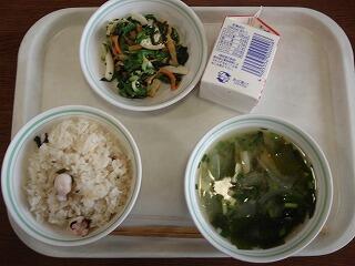 『タコごはん、呉汁、ひじきの和風マリネ、牛乳』