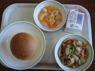 今日はふれあい給食2日目。献立は『黒糖パン、焼きそば、