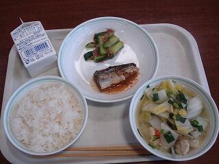 『麦ご飯、吉野汁、サバのみそ煮、おかか和え、牛乳』