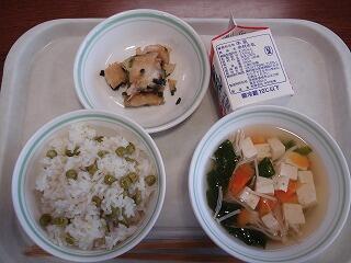 今日は『麦ご飯、チンゲンサイのスープ、枝豆と豆腐のミ