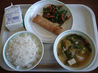 『麦ご飯、キムチスープ、インゲンのゴマ和え、春巻、牛乳』