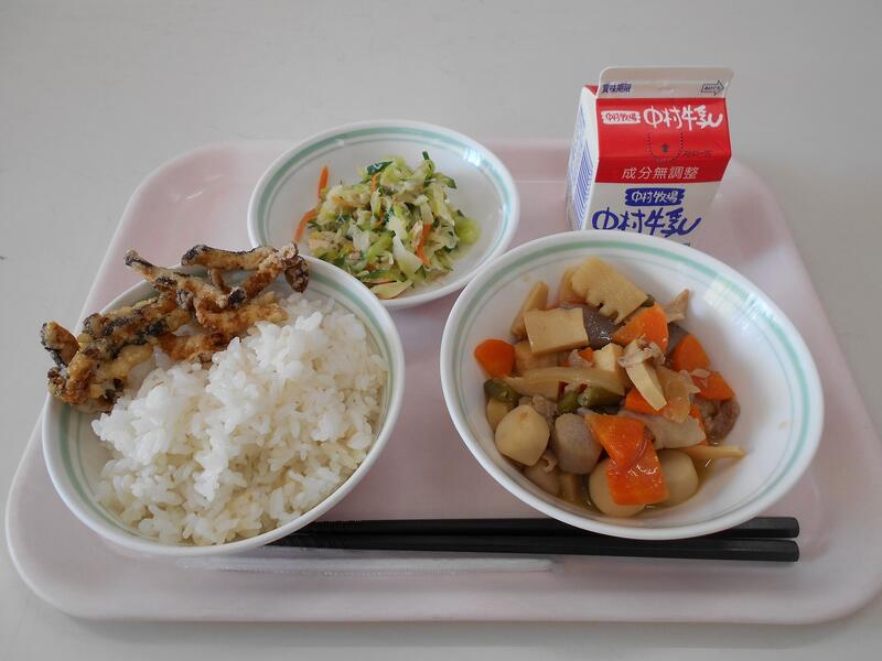 豚肉と竹の子の炒め物、きゅうりの中華和え、かりかりなばちゃん、麦ごはん、牛乳