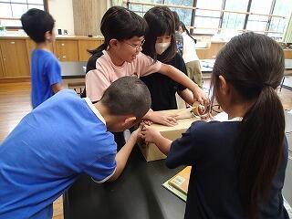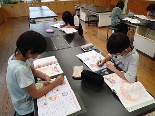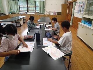 6年生は水溶液の性質について学んでいます。今回は塩酸に溶けた鉄がどうなったのかを蒸発させて調べました。保護めがねをつけて安全第一で実験に取り組んでいます。5年生はヒトの誕生について教科書やタブレットを使って調べ学習を頑張りました。自分たちの命の始まりに関する内容なので、とても集中して学習しています。4年生はとじこめた空気の性質について、段ボールを使った空気鉄砲を作って楽しみながら学びを深めました。