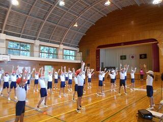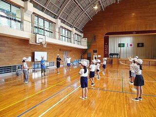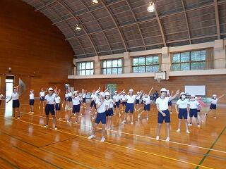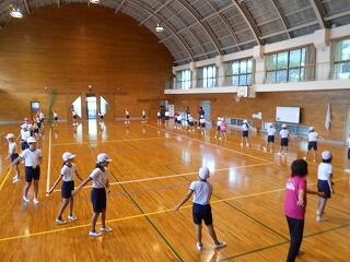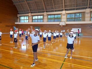 運動会に向けて、1回目の全校体育がありました。あいにくの雨で、体育館でできることを行いました。今回は入場、開会式、全校ダンスなどの練習でした。ラジオ体操の練習では体育館に子どもたちの元気なかけ声が響き渡っていました。運動会の歌も元気よく歌っていました。ダンスも楽しそうに踊っていました。