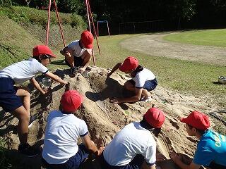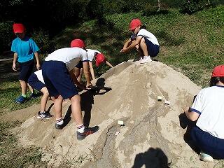 今回は理科の様子を紹介します。5年生は川の流れの特徴を砂山で水を流す実験をして確かめました。何度も水を流して、砂の削れ方やたまり方など、気づいたことをノートの書いていました。3年生は日なたと日かげの地面の温度を測りました。正しい温度計の読み方になるように気をつけていました。教科書だけでなく、体験を通して学んだことはしっかり身についていくと思います。