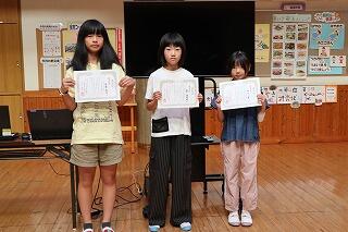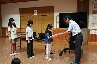 9日(木)に10月の全校朝会を実施しました。校長の話で、「夢」は自分の願いで、「志」は世のため人のためにどうしたいかという大きな目標であり、その「志」の実現のために今、何を頑張るか考えてみましょうと、子どもたちへの呼びかけをしました。生徒指導主事からは、子どもたちのために見えないところで支えてくださっている方々がいること、その方々へ感謝の気持ちをもったり、感謝の気持ちを行動で示すことの大切さについて話がありました。子どもたちは真剣な表情で話を聴いたりメモを取ったりしていました。最後に理科の自由研究で作品が出品された3人の表彰も行いました。