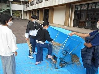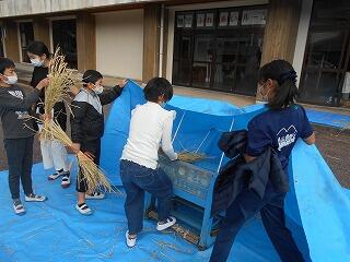 10月も今日で終わりになります。寒さが少しずつ強くなってきているので、秋が深まっているんだと感じます。今朝は、5・6年生が、稲の脱穀をするということで、足踏み脱穀機を使う作業を手伝いました。最初は戸惑っていましたが途中から、機械の扱いに慣れ、楽しく活動することができていました。