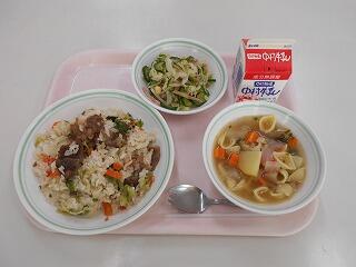 キムタクごはん、牛乳、里芋のみそ汁、和風サラダ