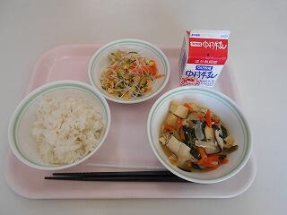 麦ごはん、牛乳、厚揚げの磯煮、りっちゃんのサラダ