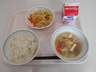 麦ごはん、牛乳、磯マヨネーズ和え、五目スープ