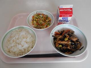 麦ごはん、牛乳、豚肉とたけのこの炒め煮、きゅうりの中華和え