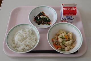 麦ごはん、牛乳、鶏肉と大豆の煮物、ほうれん草とツナのおひたし