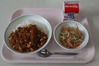 ドライカレー、牛乳、根っこ野菜のサラダ