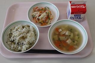 麦ごはん、牛乳、炒り豆腐、野菜のごまみそあえ